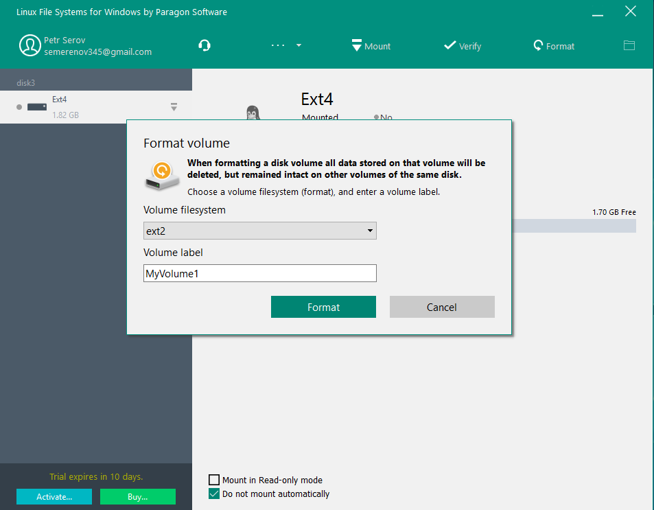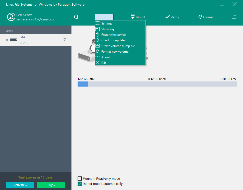 | Automount | Mounts supported volumes automatically at startup, so you don’t need to bother about it each time you restart the operating system or power your computer on. However, this feature can be disabled at any moment in the program interface. |